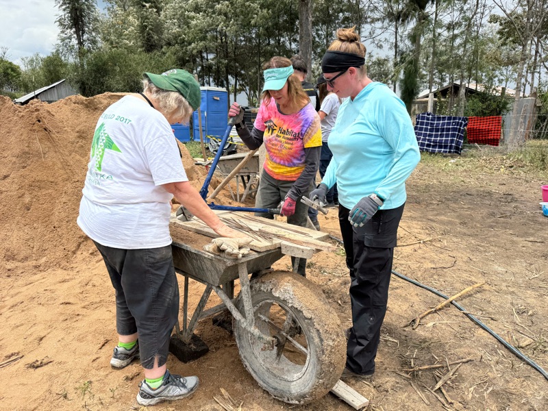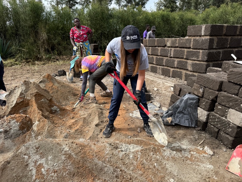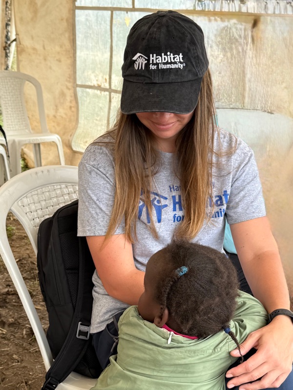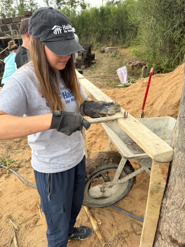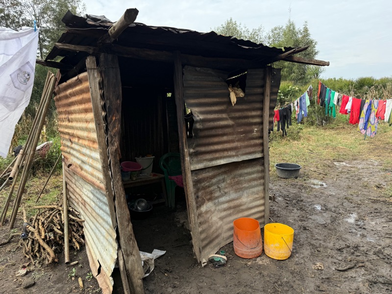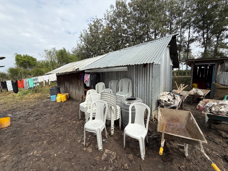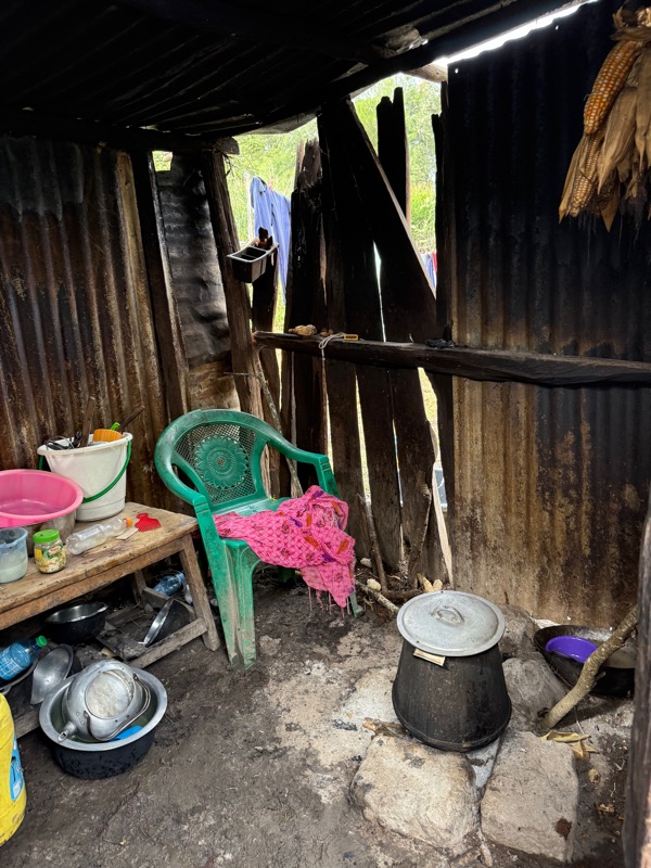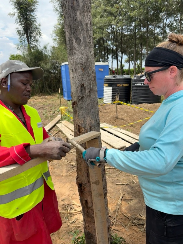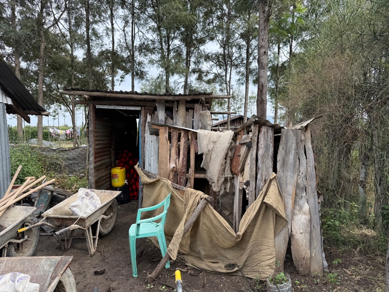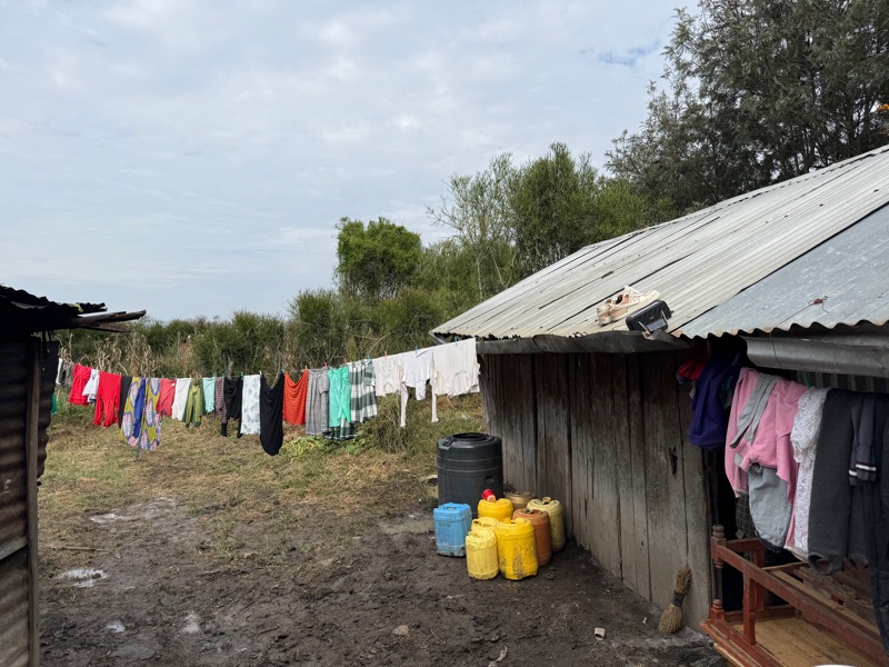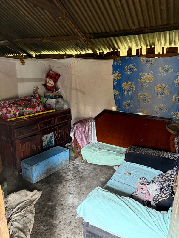 After another breakfast together at the hotel, we headed back to the build site, eager to keep the momentum going. Before getting to work, I took a quiet moment to look into Regina’s current home — just a few steps behind the one we’re building. Made from aluminum sheeting, it includes a main living space, a separate cooking room, and a detached latrine. Even just peering inside, it was clear how limited the space is. It served as a powerful reminder of why we’re here — not just to build walls, but to help build safety, dignity, and a better future.