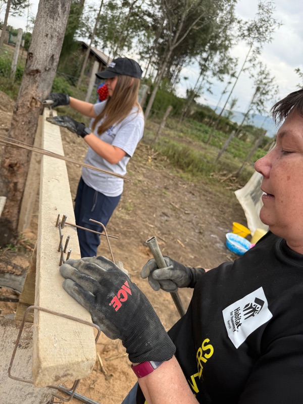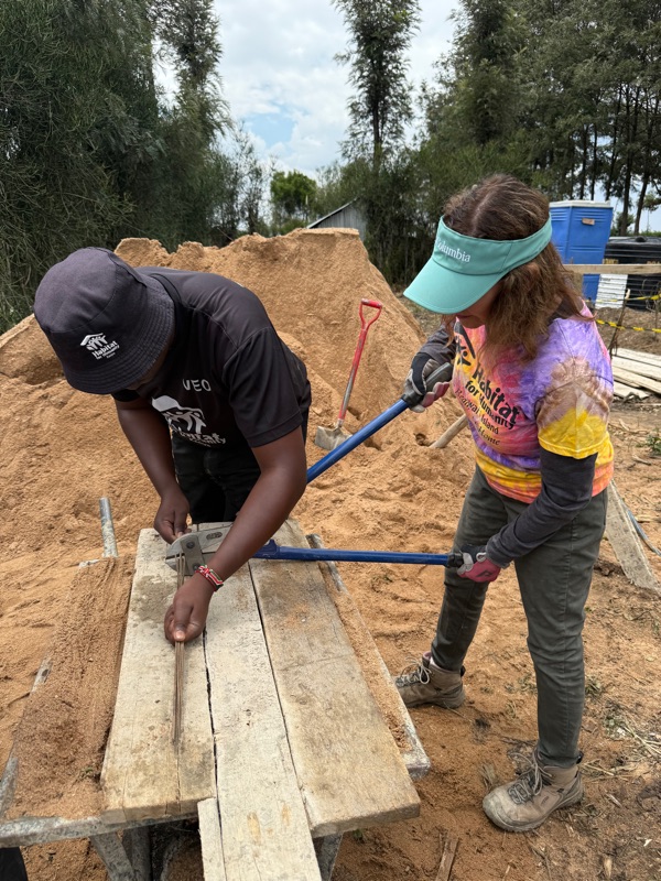 Back at the construction site, it was time to mix more cement plaster. With shovels in hand, our group got to work combining sand, water, and cement — a steady, shared effort that quickly turned into a rhythm of movement and teamwork. Once the mixture was ready, we began using it to bind new rows of bricks as we built up the outer walls of the home. Others on our team focused on preparing thick wire to secure the rebar for the roof — measuring, cutting, and bending piece after piece with care and precision.
